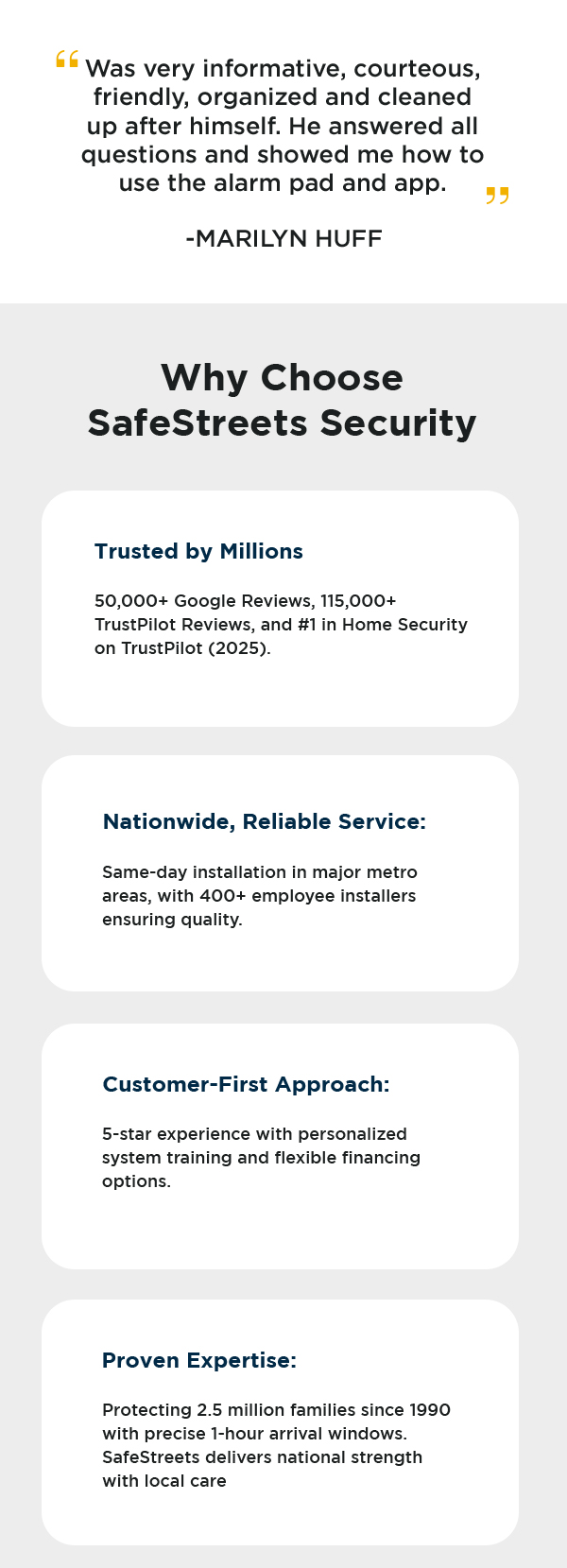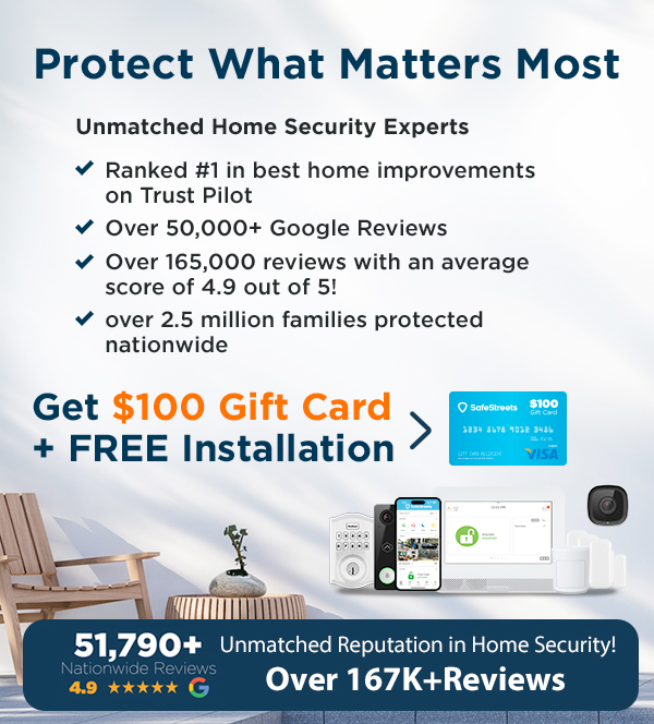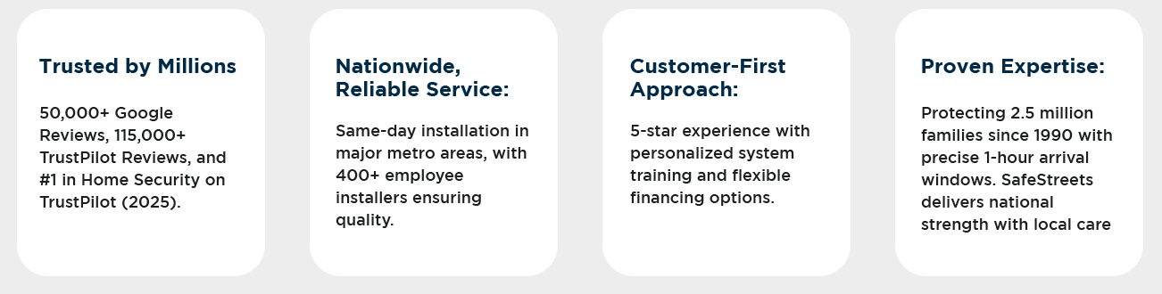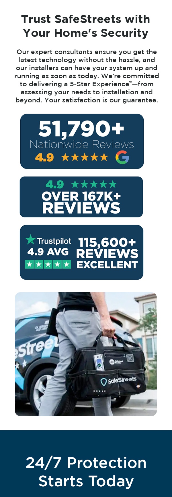 *$99-$199.00 Customer Activation Charge. 36-Month Monitoring Agreement required starting at $45.99 per month ($1,655.64). 24-Month Monitoring Agreement required per month for California ($1103.76). Form of payment must be by credit card or electronic charge to your checking or savings account. Early termination fees apply. Offer applies to homeowners only. Local permit fees may be required. Satisfactory credit history required. Certain restrictions may apply. Offer valid for new SafeStreets Authorized Provider customers only and not on purchases from SafeStreets LLC. Other rate plans available. Cannot be combined with any other offer. SafeStreets Command Interactive Services, which help you manage your home environment and family lifestyle, requires the purchase and/or activation of an SafeStreets-monitored alarm system with monitored burglary service and a compatible computer, cell phone or PDAs with Internet and email access. These SafeStreets Command Interactive Solutions Services do not cover the operation or maintenance of any household equipment/systems that are connected to the SafeStreets Command Interactive Solutions Services/Equipment. All SafeStreets Command Interactive Solutions Services are not available with the various levels of SafeStreets Command Interactive Solutions Services. All SafeStreets Command Interactive Solutions Services may not be available in all geographic areas. Standard message and data rates may apply to text alerts. You may be required to pay additional charges to purchase equipment required to utilize the SafeStreets Command Interactive Solutions Services features you desire. Two-way encryption only available with compatible SiX™ devices.